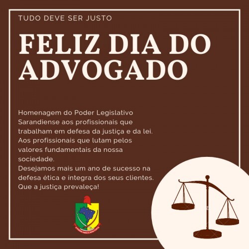 Devemos comemorá-lo, louvando a seriedade com que esses cidadãos se empenham no trato de suas causas, pela serenidade com que oferecem conforto à angústia dos que lhes procuram, além do denodo na defesa de seus clientes e a independência com que exercem esta magnífica profissão secular que é a advocacia. Homenagem da Câmara Municipal de Sarandi aos Advogados pelo seu dia.