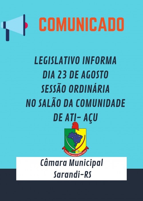 Legislativo Municipal informa a comunidade sarandiense que na próxima segunda-feira, dia 23 de agosto, a 1ª sessão ordinária descentralizada de 2021, será realizada no salão da comunidade de Ati- Açú.
