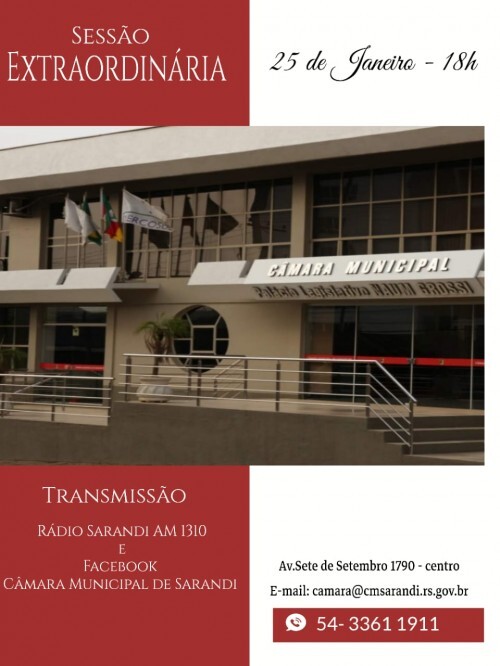 A sessão será transmitida ao vivo na página oficial da Câmara Municipal de Sarandi e Rádio Sarandi AM 1310, a partir dás 18h.