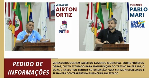 Vereadores Airton Ortiz(PDT) e Pablo Luis Alievi Mari( União Brasil) querem saber do governo municipal, qual o custo estimado da manutenção do trecho o qual o executivo requer autorização para ser municipalizado, sendo este o da ERS 404 nos próximos 10 anos; Os parlamentares buscam saber quais as obras que serão executadas no referido trecho até o ano de 2024, e se já existe projeto concluído, que seja encaminhada cópia a esta casa Legislativa. Pedem se o Município já tem os valores referentes as eventuais e possíveis despesas com custo e manutenção da ERS 404 no caso de municipalização, e ainda, se tem previsão estimada de tal receita.