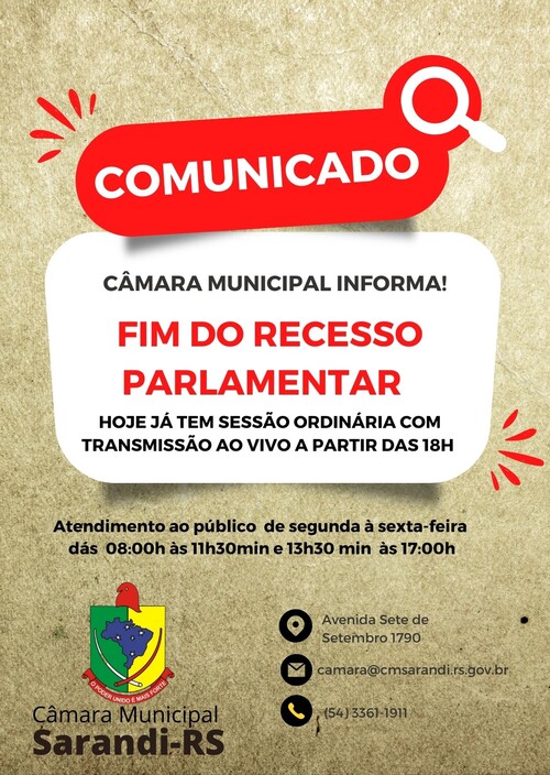 O recesso parlamentar não é exclusivo da Câmara Municipal do Sarandi. Ele ocorre em todas as casas legislativas do País e está previsto na Constituição. A suspensão dos trabalhos parlamentares ocorre tanto nas câmaras quanto nas assembleias legislativas e no Congresso Nacional, sempre duas vezes ao ano, em julho e no final de dezembro. conforme determina o artigo 8º do Regimento Interno da Câmara Municipal de Sarandi, o Legislativo esteve em recesso e já retomou as atividades.