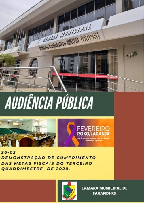 O Presidente da Câmara Municipal de Vereadores de Sarandi, vereador Wilmar José de Azeredo, em cumprimento ao disposto no art. 48 da Lei Complementar n.º 101 de 04 de maio de 2000, convida a todos os interessados a se fazerem presentes na audiência pública para demonstração de cumprimento das metas fiscais do 3º quadrimestre de 2020, a ser realizada no prédio da Câmara Municipal de Sarandi, na data de 26 de fevereiro de 2021, às 08h30min.