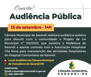 O Presidente do Poder Legislativo de Sarandi, vem através deste convidar toda comunidade local e regional, para uma importante AUDIÊNCIA PUBLICA, a realizar-se no Plenário, Luiz Agne, Av. 7 de Setembro, nº 1790, centro, Sarandi, dia 15 de setembro às 14 horas para instruir, de relevante interesse público, o Projeto de Lei Municipal nº 102 de 28 de agosto de 2023, que autoriza o município de Sarandi a firmar contrato com a Associação Hospitalar Vila Nova para a manutenção das atividades hospitalares do Hospital Comunitário de Sarandi.