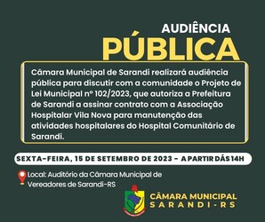 O Presidente do Poder Legislativo de Sarandi, vem através deste convidar toda comunidade local e regional, para uma importante AUDIÊNCIA PUBLICA, a realizar-se no Plenário, Luiz Agne, Av. 7 de Setembro, nº 1790, centro, Sarandi, dia 15 de setembro às 14 horas para instruir, de relevante interesse público, o Projeto de Lei Municipal nº 102 de 28 de agosto de 2023, que autoriza o município de Sarandi a firmar contrato com a Associação Hospitalar Vila Nova para a manutenção das atividades hospitalares do Hospital Comunitário de Sarandi.