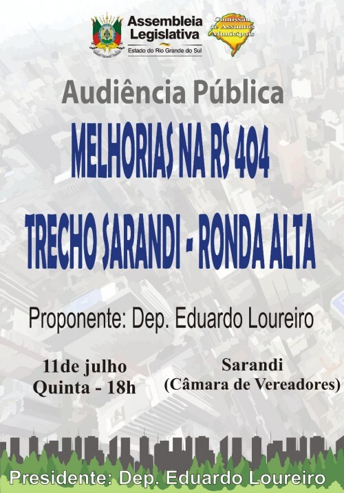 Audiência Públlica será realizada no Plenário da Câmara Municipal de Vereadores de Sarandi,no dia 11 de Julho de 2019 a partir das 18:00horas.