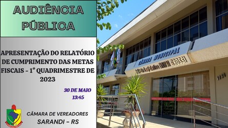 A Prefeitura Municipal de Sarandi CONVIDA todos os interessados a fazerem parte da Audiência Pública para Apresentação do Relatório de Cumprimento das Metas Fiscais do 1° QUADRIMESTRE DE 2023, que acontecerá em 30 DE MAIO, às 13:45, no Plenário Legislativo Luiz Agne, nas dependências da Câmara Municipal de Vereadores de Sarandi – RS, situada na Avenida Sete de Setembro, 1790, Centro.