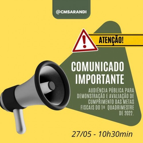 O Presidente da Câmara Municipal de Vereadores de Sarandi, Vereador Airton Ortiz, em cumprimento ao disposto no art.48 da Lei Complementar n. º101 de 04 de maio de 2000, convida a todos os interessados a se fazerem presentes na audiência pública para demonstração e avaliação de cumprimento de metas fiscais do 1º quadrimestre de 2022, a ser realizada na sala de Sessões da Câmara Municipal de Sarandi, na data de 27 de maio de 2022, às 10h30min