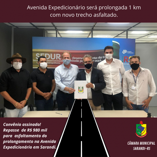 Presidente do Poder Legislativo Airton Ortiz e 2º Secretário Dalmir Nunes integrantes da Bancada do PDT, reforçando o compromisso do Poder Legislativo com a comunidade, acompanham governo municipal em ato de assinatura do termo de repasse de recursos no programa pavimento RS para o município de Sarandi. No último dia 18 de janeiro, Airton Ortiz e Dalmir Nunes, estiveram reunidos na capital do estado, acompanhados pelo Prefeito Municipal Sr. Nilton Debastiani e o Secretário de Obras urbanas e Planejamento Sr. Carlos Eduardo Portes da Silva, em ato de assinatura do convênio entre Governo do Estado, através da Secretaria de Desenvolvimento Urbano e Metropolitano e o Município no âmbito do programa Pavimenta RS. A ação faz parte do projeto que tornará este prolongamento da Avenida Expedicionário em área comercial. Os recursos repassados pelo governo do Estado ao município somam o montante de R$ 988.851,00 viabilizando o prolongamento desta importante Avenida de nosso município em até 1 km com novo trecho asfaltado, logo acima do trevo da RS 404, na estrada Sarandi - Natalino.