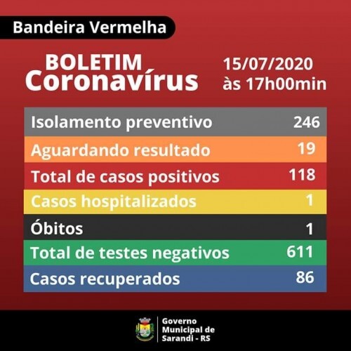 Boletim epidemiológico desta quarta-feira, 15 de julho, divulgado às 17h00min.