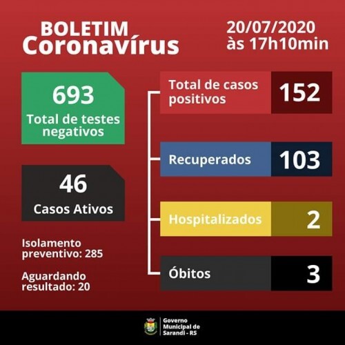 Boletim epidemiológico desta segunda-feira, 20 de julho, divulgado às 17h10min.