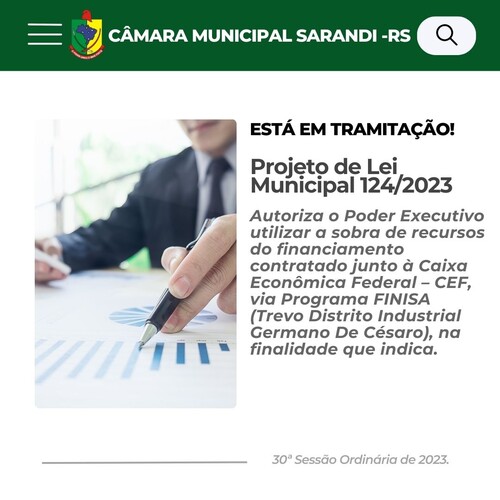 Começou a ser discutido na Câmara de Vereadores de Sarandi, projeto de lei que autoriza o Poder Executivo utilizar a sobra de recursos do financiamento contratado junto à Caixa Econômica Federal – CEF, via Programa FINISA (Trevo Distrito Industrial Germano De Césaro), na finalidade que indica.
