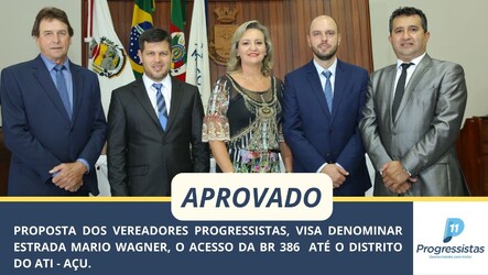 De autoria dos vereadores da Bancada Progressista, Cássio, Jonka, Tatiana Regina Pelizari, Osvaldo Signor e Aleão Azeredo, PL tem por finalidade, prestar uma justa homenagem ao saudoso Senhor Mario Wagner, dada a importância de se valorizar as famílias que ajudaram, de alguma forma, no desenvolvimento e na construção da história do Município de Sarandi/RS.