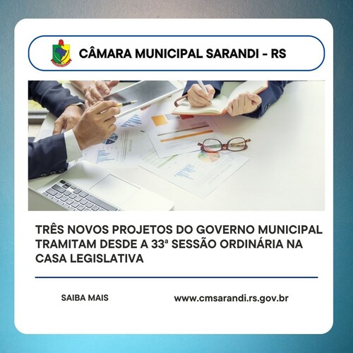 Durante a 33ª sessão ordinária de 2023, três novos projetos da Prefeitura, deram entrada na Câmara Municipal e estão sendo analisados pelo setor Jurídico e posteriormente pelas comissões.