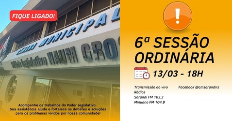 Participe da 6ª sessão, podendo ser de forma presencial ou pelo Facebook. Os trabalhos serão transmitidos a partir dás 18h, através das Rádios Sarandi e Minuano FM.