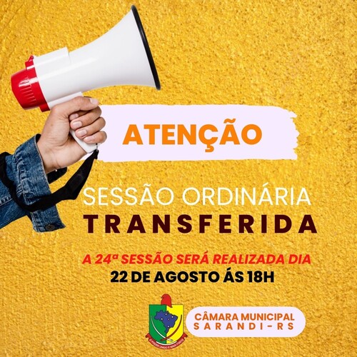 Vereador JAIRO ANTONIO CORSO, Presidente da Câmara de Vereadores de Sarandi, no uso de suas atribuições, informa a toda comunidade que, em virtude de compromissos do Presidente e dos Vereadores Líderes das Bancadas na cidade de Porto Alegre em 21/08/2023, torna-se necessária a transferência da sessão ordinária.