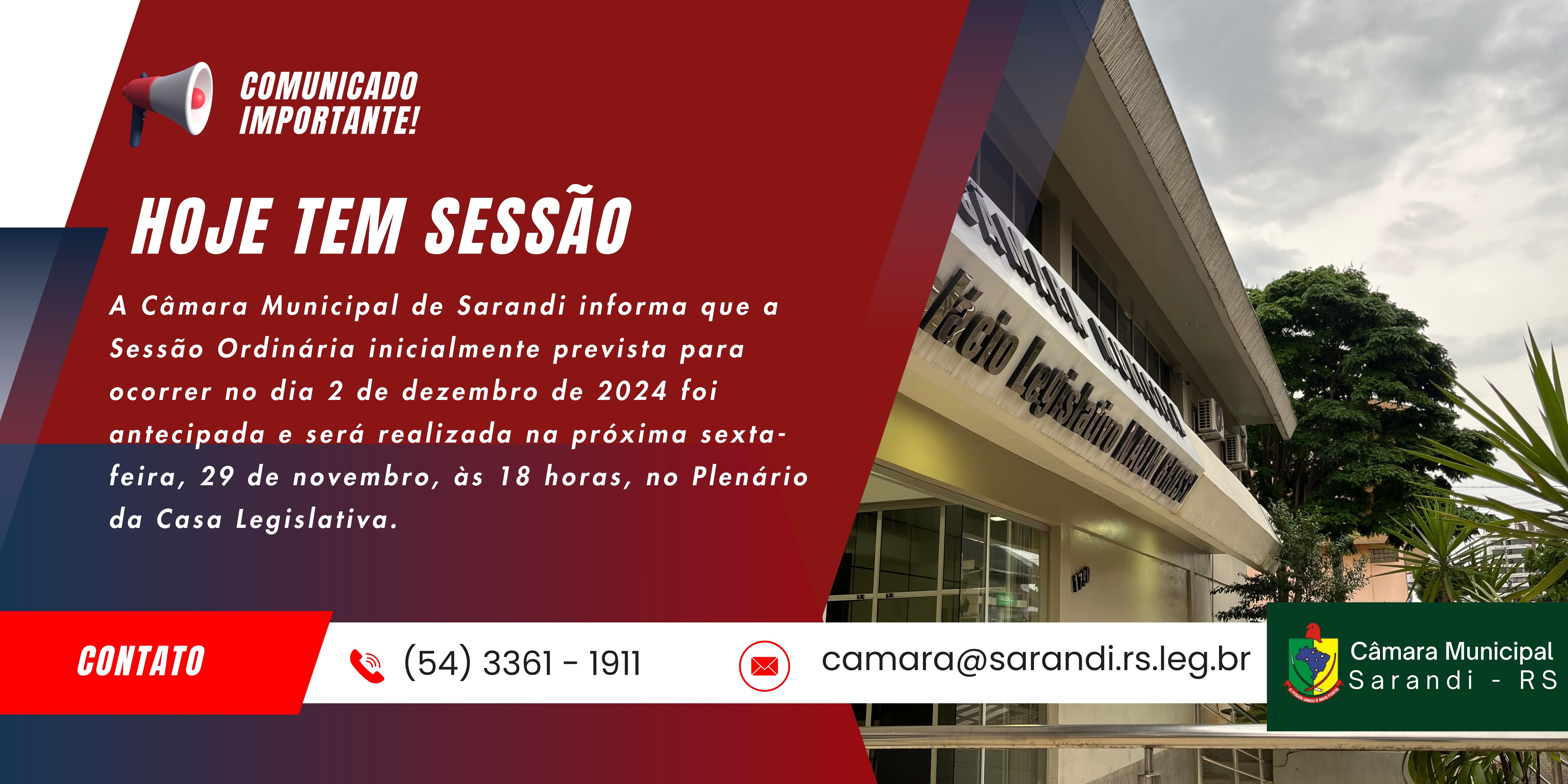 A Câmara Municipal de Sarandi informa que a Sessão Ordinária inicialmente prevista para ocorrer no dia 2 de dezembro de 2024 foi antecipada e será realizada na próxima sexta-feira, 29 de novembro, às 18 horas, no Plenário da Casa Legislativa.