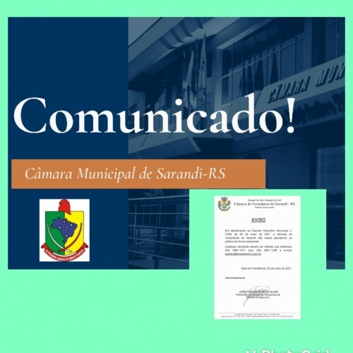 Em atendimento ao Decreto Executivo Municipal n. 3.922 de 25 de maio de 2021 a Câmara de Vereadores de Sarandi não estará atendendo ao público de forma presencial. Qualquer demanda deverá ser através dos telefones: (54) 3361-1911 e/ou (54) 3361-1336 e e-mail: camara@cmsarandi.rs.gov.br.