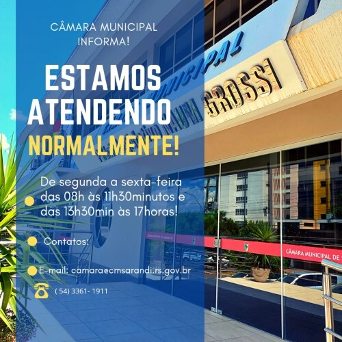 A Câmara Municipal informa que está em recesso parlamentar até dia 02/02/2022, ou seja, sem sessões e reuniões de comissões, porém, estamos abertos com atendimento nos gabinetes e na área administrativa. Neste período somente as sessões deixarão de serem realizadas. A secretaria da Casa prossegue com os atendimentos ao público normalmente das 08:00 as 11h30min e das 13h30min até as 17:00horas. Os trabalhos dos servidores e vereadores seguem normalmente. A primeira sessão de 2022 está prevista a ser realizada em 07 de fevereiro. A comunidade também poderá entrar em contato com a Câmara através seguintes meios de comunicação: