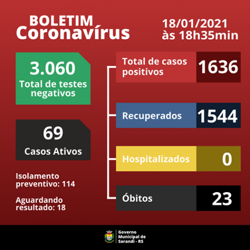 Boletim epidemiológico desta segunda-feira, 18 de janeiro de 2021.