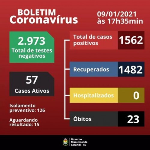 Boletim epidemiológico deste sábado, 09 de janeiro de 2021.