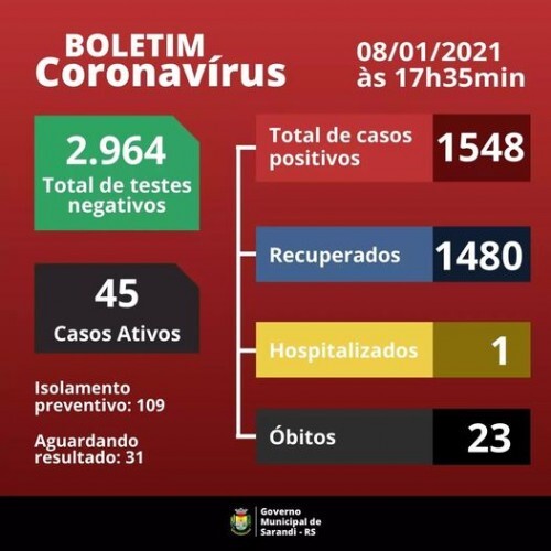 Boletim epidemiológico desta sexta-feira, 08 de janeiro de 2021.