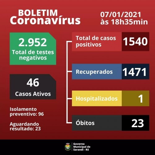Boletim epidemiológico desta quinta-feira, 07 de janeiro de 2021.
