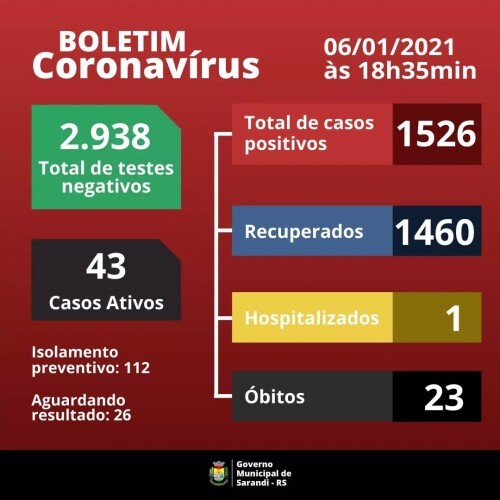 Boletim epidemiológico desta quarta-feira, 06 de janeiro de 2021.