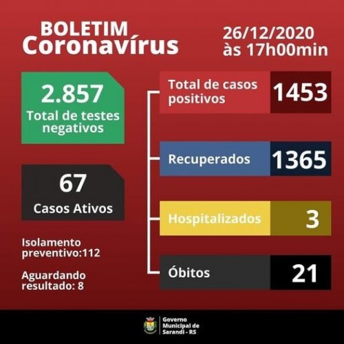 Boletim epidemiológico deste sábado, 26 de dezembro de 2020