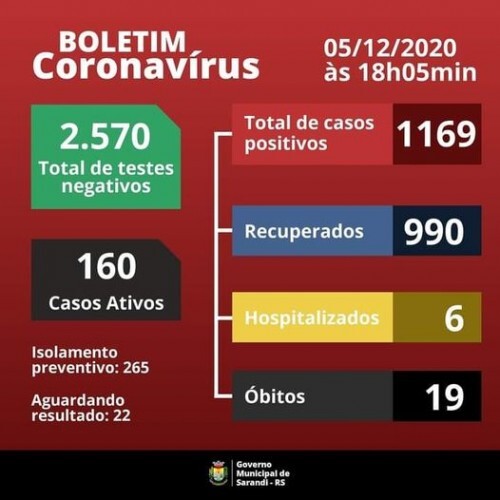 Boletim epidemiológico deste sábado, 05 de dezembro de 2020.