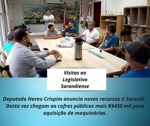 A Câmara Municipal de Sarandi, recebeu na manhã da última quarta-feira (13), a visita do deputado federal Nereu Crispim(PSD-RS), juntamente com seu assessor parlamentar Rodrigo Doug e o Coordenador de Gabinete do RS Vinicius Boff. O deputado foi recepcionado pelo presidente do Legislativo Airton Ortiz em seu gabinete, além dos vereadores Alemão Azeredo vice-presidente, Marcelo Barbosa líder da bancada do PDT e líder do governo na Câmara também pelo vereador Pablo Mari atual 1º secretário.