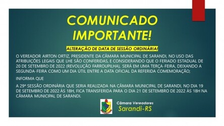 A 29ª Sessão Ordinária que seria realizada na Câmara Municipal de Sarandi, no dia 19 de setembro de 2022 às 18h, fica TRANSFERIDA para o dia 21 de setembro de 2022 às 18h na Câmara Municipal de Sarandi.
