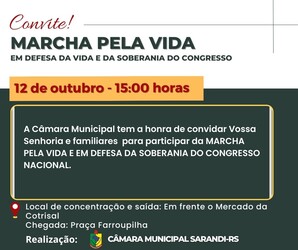 Não esqueça é na próxima quinta-feira, dia 12 de outubro a partir dás 15h, concentração e saída em frente ao Mercado Cotrisal até a Praça Farroupilha, venha defender a vida e o Congresso.