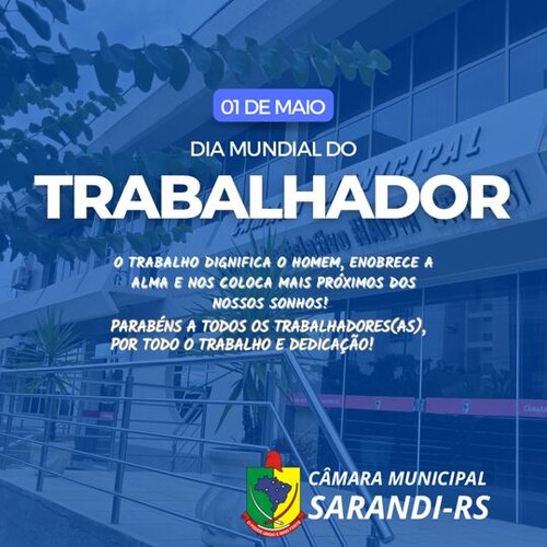No dia 1º de Maio, quando se comemora o Dia do Trabalhador, a Câmara Municipal se dirige aos trabalhadores e trabalhadoras Sarandienses para manifestar o reconhecimento do Legislativo Municipal ao valioso trabalho, dedicação e contribuição que todas as classes trabalhadoras exercem para o crescimento e desenvolvimento do nosso município.