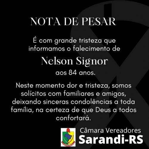 A Câmara Municipal de Sarandi lamenta, com muito pesar, o falecimento de do Sr. Nelson Signor, aos 84 anos, ocorrido na manhã de ontem, 24 de setembro de 2022, em Passo Fundo. Nelson Signor, integrou o Legislativo Sarandiense, exercendo a função de Vereador por 2 mandatos. No primeiro, foi eleito pela Bancada ARENA - Aliança Renovadora Nacional na 7ª legislatura anos 1973- 1977. No segundo, mandato, foi eleito na 8ª legislatura, anos de 1977 a 1983, realizando importantes trabalhos e, prol do povo desta cidade. Neste momento de extrema dor, que se estende aos demais familiares e amigos, os 11 colegas do parlamento enlutado, juntamente com os servidores desta Casa, expressam votos do mais profundo pesar. Nesta hora tão difícil de separação, dor e tristeza, somos solícitos com familiares e amigos, deixando sinceras condolências a toda família, na certeza de que Deus a todos confortará. Seu sepultamento está sendo realizado no Cemitério desta cidade.