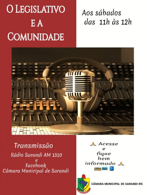 Acompanhe aos sábados das 11h às 12h pela Rádio Sarandi AM 1310, e na página oficial da Câmara Municipal de Sarandi o programa O Legislativo e a Comunidade.