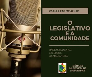 A missão deste programa é a aproximação do Poder Legislativo com o cidadão sarandiense. Também fortalecer a transparência desta Casa e tornar dia a dia, as informações mais acessíveis à nossa população. Com esta finalidade, é que, em mais um sábado, estaremos ao vivo em nossa página oficial no Facebook (@CMSARANDIRS), também pela rádio Sarandi AM, a partir dás 11 h até as 12 h, com muitas informações, com o resumo da sessão de segunda-feira(05), além de outras indicações, tramitação de projetos e entrevistas com nossos vereadores. Acesse e fique muito bem informado, pois estas ferramentas servem para somar, e nos deixar conectados, ligados, com você cidadão sarandiense, pois onde você estiver, estaremos sempre juntos. Nossa gratidão a todos, por acompanhar os trabalhos do Poder Legislativo, através do rádio e Facebook.