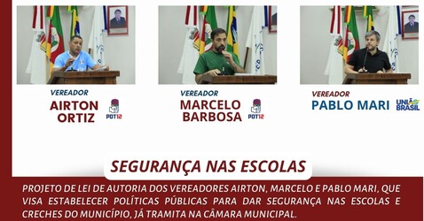 De autoria dos vereadores Airton Ortiz, Marcelo Barbosa (PDT) e Pablo Mari (União Brasil), PL nº 23/2023, tem por finalidade, proporcionar maior segurança aos alunos, professores e todas as pessoas que trabalham nas escolas, diminuindo assim, o índice de criminalidade no ambiente escolar.