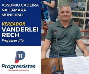 Na sessão ordinária da última segunda-feira (03/04), o vereador 1º suplente Vanderlei Rech – PP tomou posse, na Câmara Municipal de Sarandi, em substituição a vereadora Tatiana Regina Pelizari, que está de licença por 30 dias. Vanderlei Rech (Professor Jiló) obteve 334 votos nas eleições municipais de 2020.