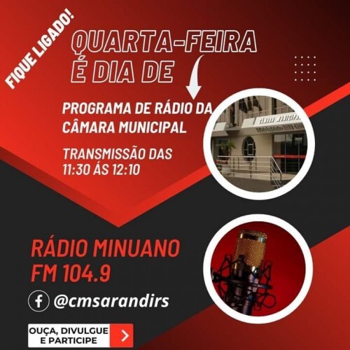 Sintonize e acompanhe logo mais a partir da 11h30min pela Rádio Minuano 104.9 FM, o novo programa de rádio da Câmara de Vereadores de Sarandi.