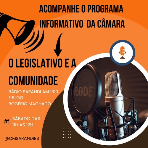 Acesse @cmsarandirs, Rádio Sarandi AM 1310 e Blog Rogério Machado. Neste programa você poderá acompanhar os trabalhos do seu vereador, também ficar por dentro de tudo que é destaque no Poder Legislativo.