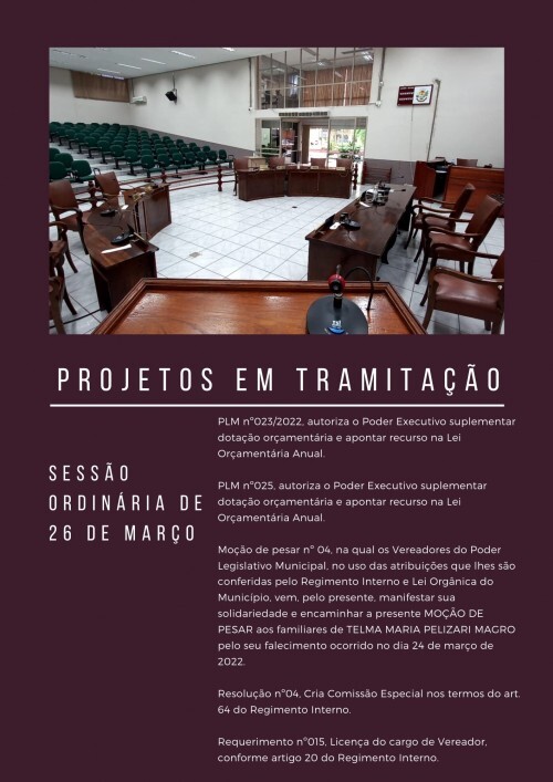 PLM nº023/2022, autoriza o Poder Executivo suplementar dotação orçamentária e apontar recurso na Lei Orçamentária Anual. Fica o Poder Executivo autorizado suplementar a seguinte dotação orçamentária na Lei Orçamentária Anual (Lei Municipal nº 5283/2021): SECRETARIA MUNICIPAL DA SAÚDE, visando a manutenção do Consórcio Intermunicipal de Saúde – Outros Serviços de Terceiros Pessoa Jurídica, recursos no montante de R$ 50.000,00(cinquenta mil reais). Os recursos são de origem da Câmara Municipal, desta forma garantindo que a Secretaria Municipal de Saúde tenha as necessárias condições orçamentárias para viabilizar os pagamentos de exames que são realizados através do Consórcio Intermunicipal da Saúde.