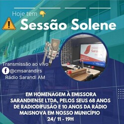 Câmara Municipal realizará hoje a partir das 19h, Sessão Solene em homenagem à Emissora Sarandiense Ltda, pelos seus 68 anos de radiodifusão e 10 anos da Rádio Maisnova em nosso município. O Presidente da Câmara Municipal de Vereadores de Sarandi – RS tem a honra de convidar Vossa Senhoria e familiares para assistirem a transmissão da Sessão Solene através do Facebook @cmsarandirs e ao mesmo tempo através do rádio Rádio Sarandi AM.