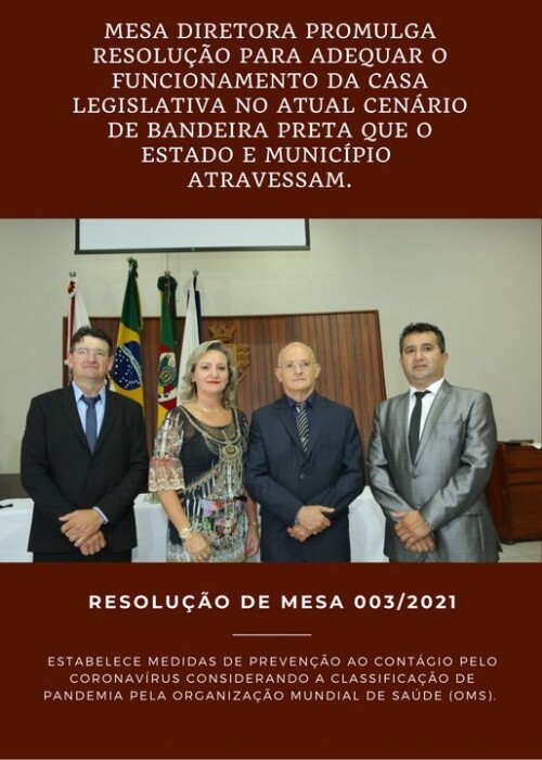 CONSIDERANDO a necessidade de proteção e isolamento social dos servidores, prioriza-se o trabalho remoto ou, ainda, em atividade ou local que reduza o contato com outros trabalhadores e o público; havendo necessidade do trabalho presencial, a Diretoria da Câmara orientará previamente e adotará para estes servidores o funcionamento em escala priorizado o trabalho em local arejado e higienizado, e observadas as demais medidas de segurança, a Mesa Diretora da Câmara Municipal de Vereadores de Sarandi, Estado do Rio Grande do Sul, no uso de atribuições que lhe são asseguradas pela legislação em vigor, F A Z S A B E R que promulga a seguinte: