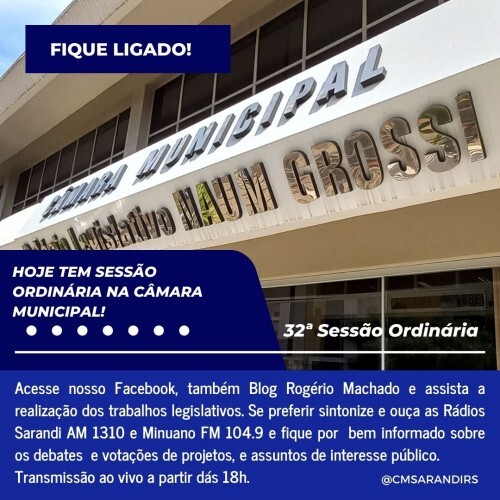 Logo mais a partir dás 18h, acontecerá a 32ª Sessão Ordinária deste ano. Os trabalhos terão transmissão ao vivo. O cidadão poderá acompanhar os trabalhos por meio das rádios Sarandi AM 1310 e Minuano FM. Se preferir, assista a LIVE em nossa página no Facebook e ao mesmo tempo pelo Blog Rogério Machado.