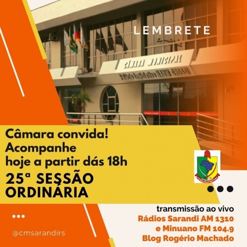 As sessões ordinárias da Câmara Municipal de Sarandi são públicas e qualquer cidadão pode participar, obedecidas as regras regimentais. Durante as sessões os cidadãos podem acompanhar de perto os debates, as votações, posições e iniciativas dos parlamentares, como sugestões de melhorias, pedidos de informações, moções dentre outras atividades de interesse da comunidade. As sessões ordinárias da Câmara ocorrem toda segunda-feira às 18:00h, em seu Plenário, localizado na avenida sete de setembro 1790, no centro de Sarandi. Não pode comparecer pessoalmente à Sessão? Não tem problema, as sessões são transmitidas ao vivo em nossa página no Facebook (@cmsarandirs) e Blog do Rogério Machado. Ouça também os trabalhos, através das Rádios Sarandi AM 1310 e Minuano FM 104.9. Sua