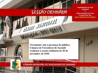 Novamente sem a presença de público, Câmara de Vereadores de Sarandi realizará a Sessão Ordinária de 30 de Novembro de 2020. A sessão, será transmitida ao vivo, pela página oficial da Casa de Leis no Facebook, também pela Rádio Sarandi AM 1310 a partir dás 18 horas. Acontecerá novamente sem a presença do público, como medida de prevenção a propagação do Coronavírus. Confira a relação prévia de projetos que a princípio estarão na pauta da sessão ordinária de hoje, caso não recebam pedido de informação até o horário previsto no regimento interno e se não forem retirados de pauta pelos seus propositores.