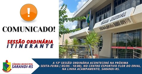 A Câmara de Vereadores de Sarandi estará realizando, na próxima SEXTA-FEIRA, dia 05 de maio, sua Sessão Ordinária fora da sua sede. A 1ª Sessão Itinerante deste mês acontecerá a partir das 18h nas dependências do Centro Esportivo Flor do Erval, Linha Acampamento, Sarandi-RS. Segundo o Presidente da Câmara de Vereadores, Jairo Antônio Corso, a intenção em realizar a Sessão Itinerante é aproximar o Poder Legislativo da comunidade. O programa das sessões itinerantes da Câmara Municipal será desenvolvido nas comunidades de nosso município ao longo do ano, começando nesta sexta-feira (05/05). A sessão itinerante serve para a interiorização do Poder Legislativo e de suas atividades e interação com todas as comunidades, buscando ouvir reais necessidades dos munícipes, facilitando, assim, a concretização de nossas metas com nosso povo, que a de atender cada vez melhor toda população.