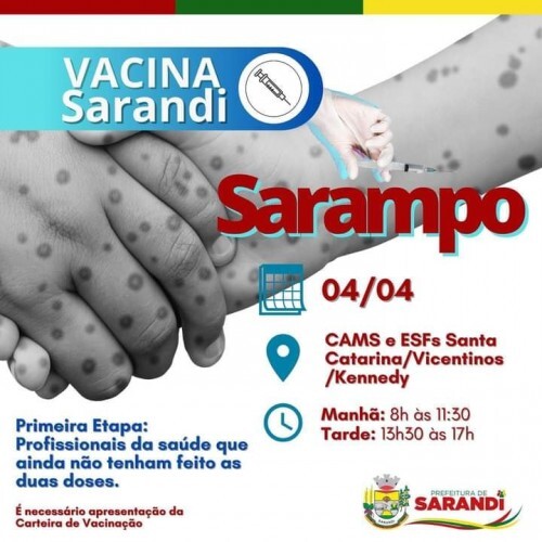 A vacina contra o Sarampo também terá seu primeiro dia de vacinação nesta segunda-feira, dia 04/04, etapa voltada aos profissionais da saúde que ainda não tem as doses completas.