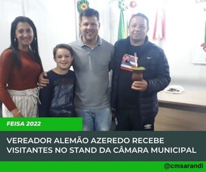 No Stand da Câmara, junto a Feisa2022, o Vice- presidente Alemão Azeredo, recebeu várias lideranças locais e regionais, além de munícipes que visitaram a feira entre os dias 20 a 24 de abril. No evento, o parlamentar, cumpriu expediente e pode ouvir e receber algumas demandas da população. Também esteve realizando ações de representatividade. Ainda este sanando algumas dúvidas dos munícipes, nos assuntos que permeiam sobre encaminhamento de sugestões de melhorias do povo ao vereador e posteriormente ao governo municipal.