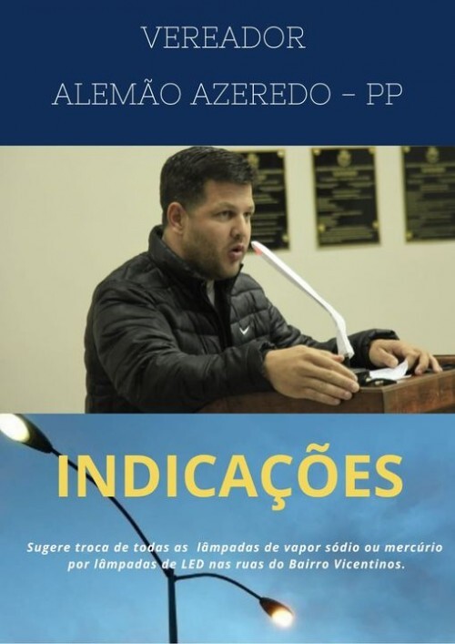 Alemão Azeredo em sua indicação destaca que, após receber as demandas dos moradores Bairro Vicentinos, vem por meio desta, solicitar aos órgãos competentes que possam analisar a viabilidade e posteriormente iniciar a troca das lâmpadas. Cabe ressaltar que em parte da Rua Marcos Novello, rua de acesso ao bairro, a mesma já possui as lâmpadas de LED.